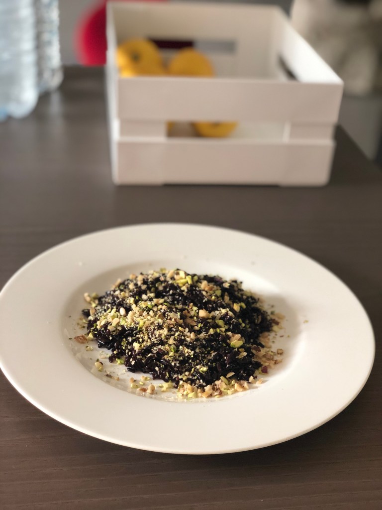 Niente di complesso, lessare il riso e nel frattempo tritare la frutta secca. Quando il riso è cotto, scolarlo e aggiungere un filo d’olio. Spolverare la frutta secca tritata a modi parmigiano.